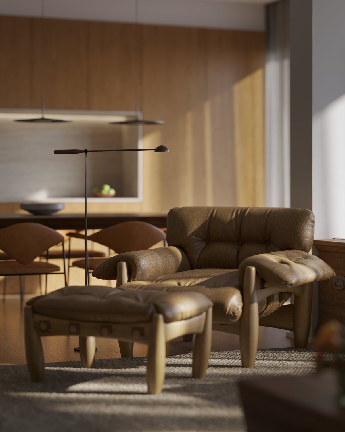 A iluminação pontual e as plantas naturais completam o conjunto, trazendo conforto visual e vivacidade ao ambiente. A cliente, apaixonada por design e mobiliário assinado, desejava um espaço com identidade e alma, que revelasse sua essência de forma discreta e atemporal.
