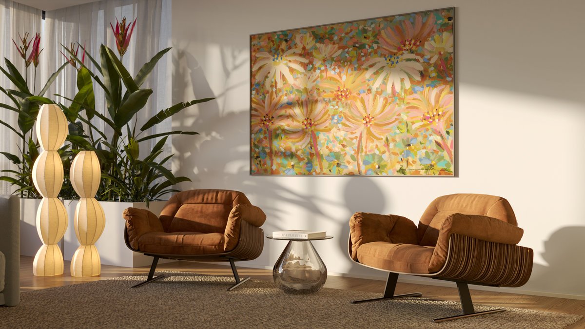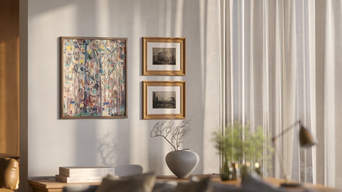 A base neutra, com lâmina de madeira e texturas suaves nos tapetes, cria um pano de fundo que acolhe os quadros e mobiliários do acervo pessoal da cliente — peças cheias de significado, que contam histórias vividas. O antigo baú da família, incorporado ao layout, reforça essa conexão afetiva entre o passado e o presente.