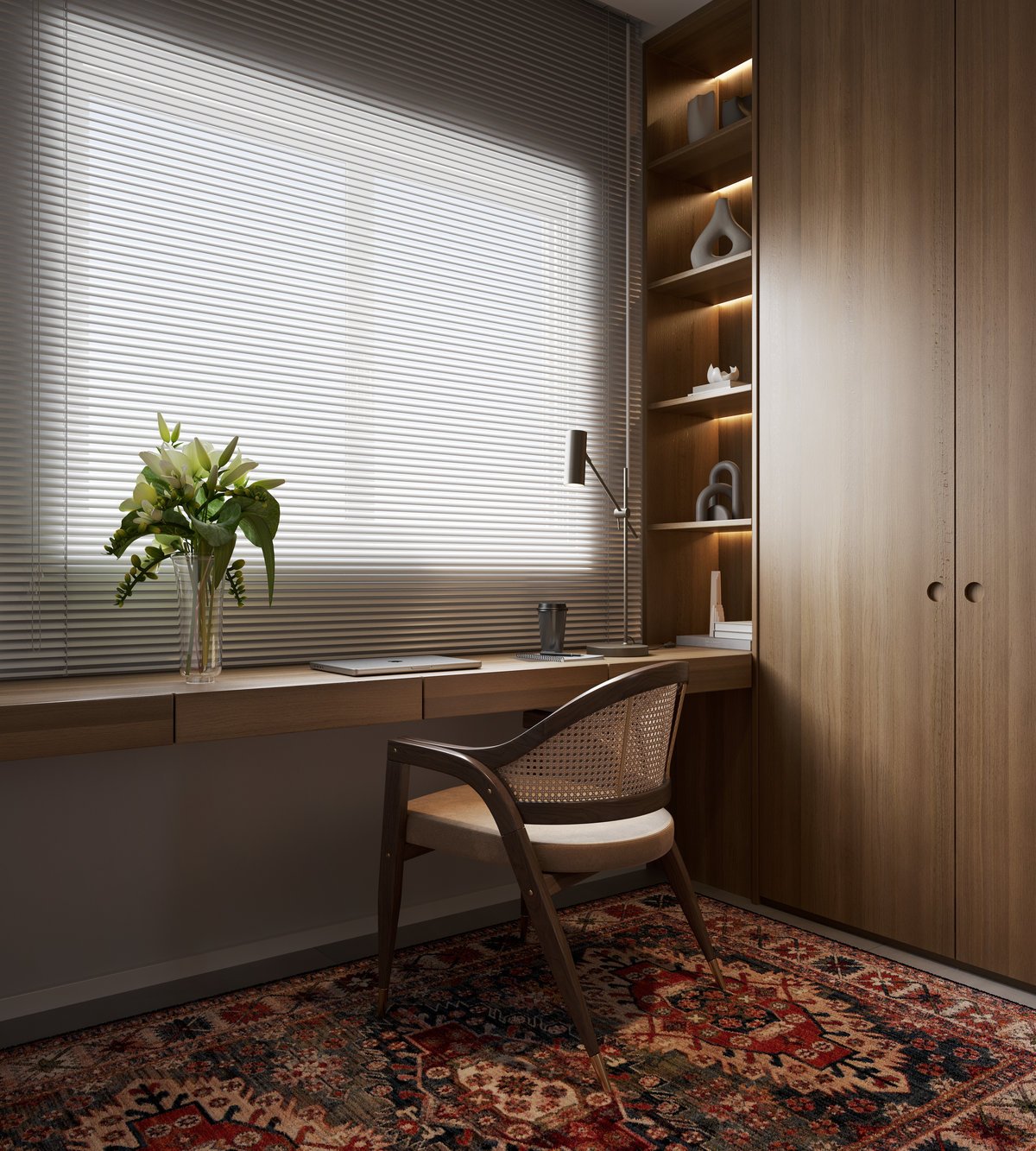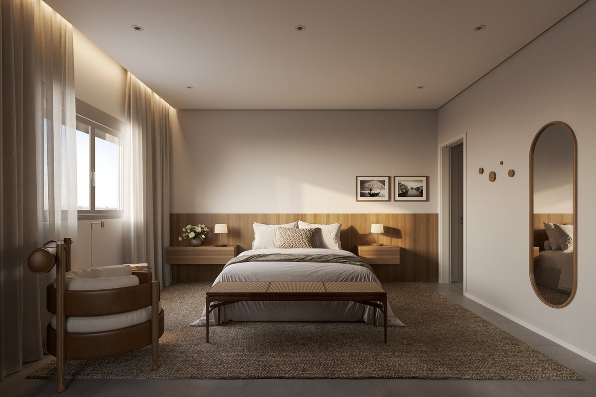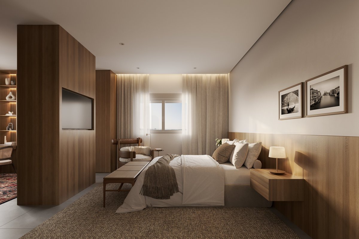 O resultado é um ambiente fluido, com circulação leve e contínua, onde o tapete persa adiciona cor e personalidade, e a mesa de trabalho se integra discretamente ao quarto. Um refúgio equilibrado entre estética e conforto, pensado para refletir a rotina e os desejos do casal.